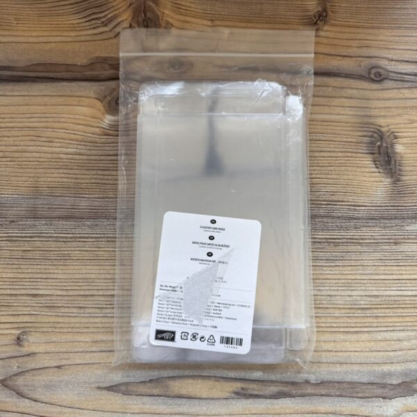 Die Azetatschachteln Für Karten C6 von Stampin’ Up! (145486) bestehen aus durchsichtigem Acetat und sind speziell zur Aufbewahrung sowie Präsentation von Karten im Format C6 entworfen. Diese Packung enthält 8 flachliegende Schachteln, die sich einfach durch Falten zusammenbauen lassen. Die Maße einer aufgebauten Schachtel betragen etwa 16,5 x 11,6 x 1,6 cm und sie bieten Platz für mehrere Karten inklusive Umschlag. Die Schachteln sind neutral gestaltet und eignen sich besonders für die individuelle Weiterverzierung. Ursprünglich als Zubehörprodukt für Kartenbastler im Stampin’ Up! Minikatalog 2017 aufgeführt, bieten sie eine flexible Möglichkeit, selbstgemachte Karten stilvoll zu verpacken.