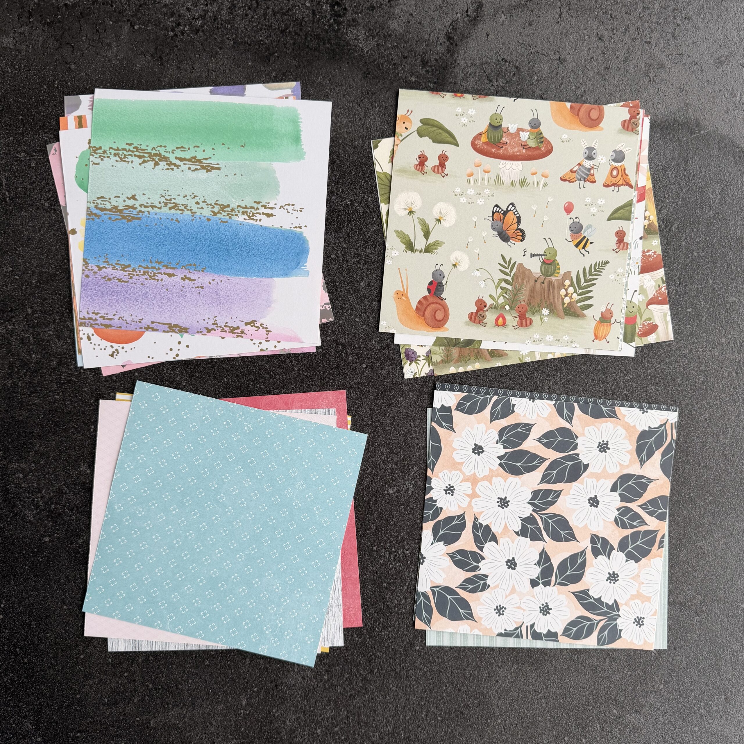 Bei diesem Angebot hier sind 70 Zuschnitte aus folgenden Papieren in ca. 15,2 x 15,2 cm (6 x 6″) dabei:
