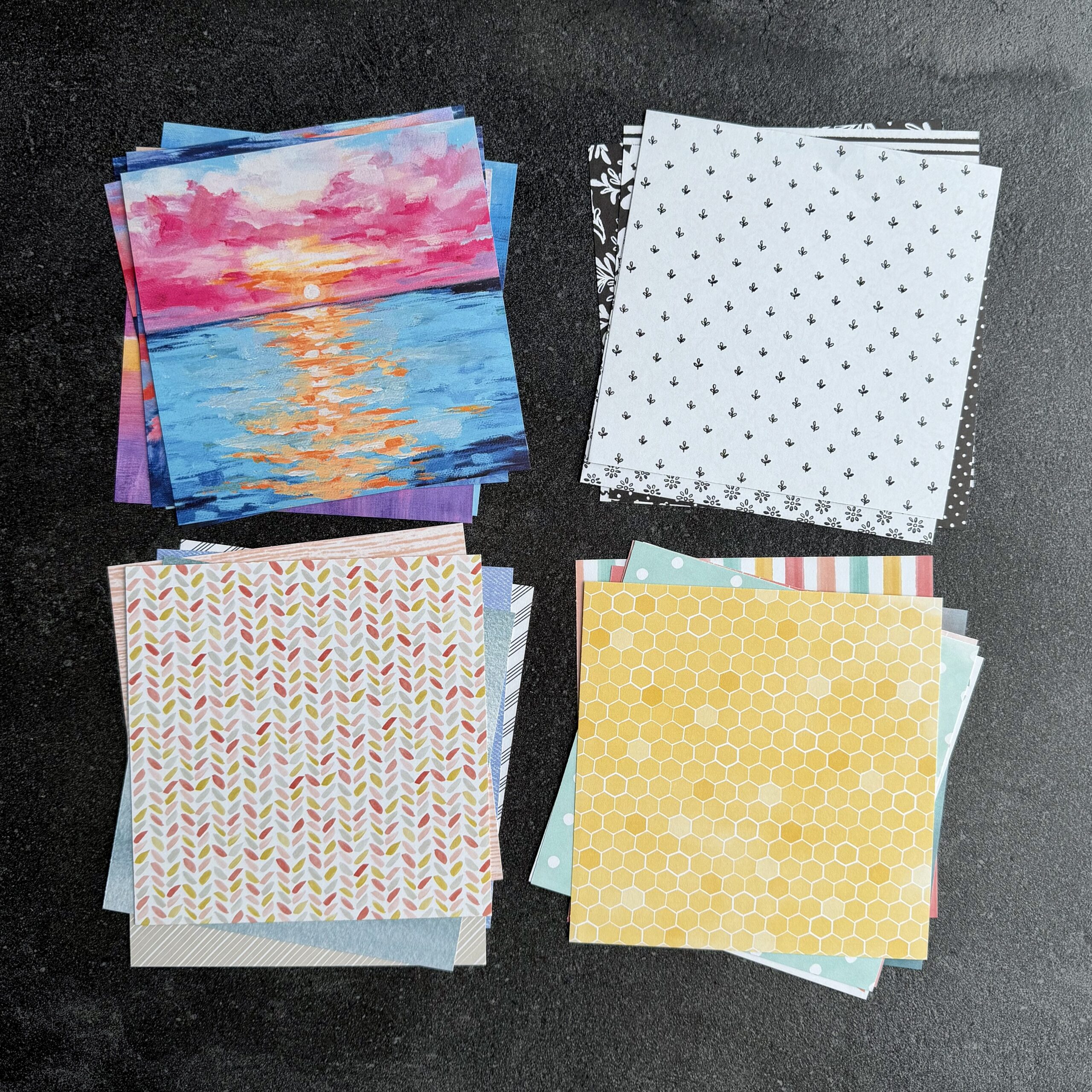 Bei diesem Angebot hier sind 74 Zuschnitte aus folgenden Papieren in ca. 15,2 x 15,2 cm (6 x 6″) dabei: